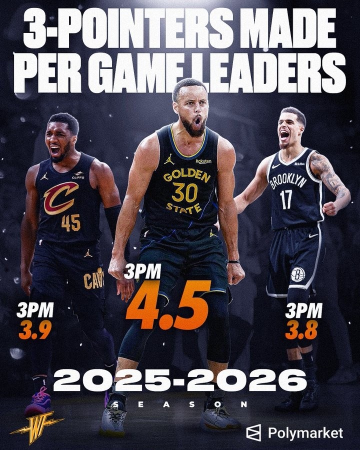 场均三分榜单,库里唯一4+,场均4.5个领跑全联盟!