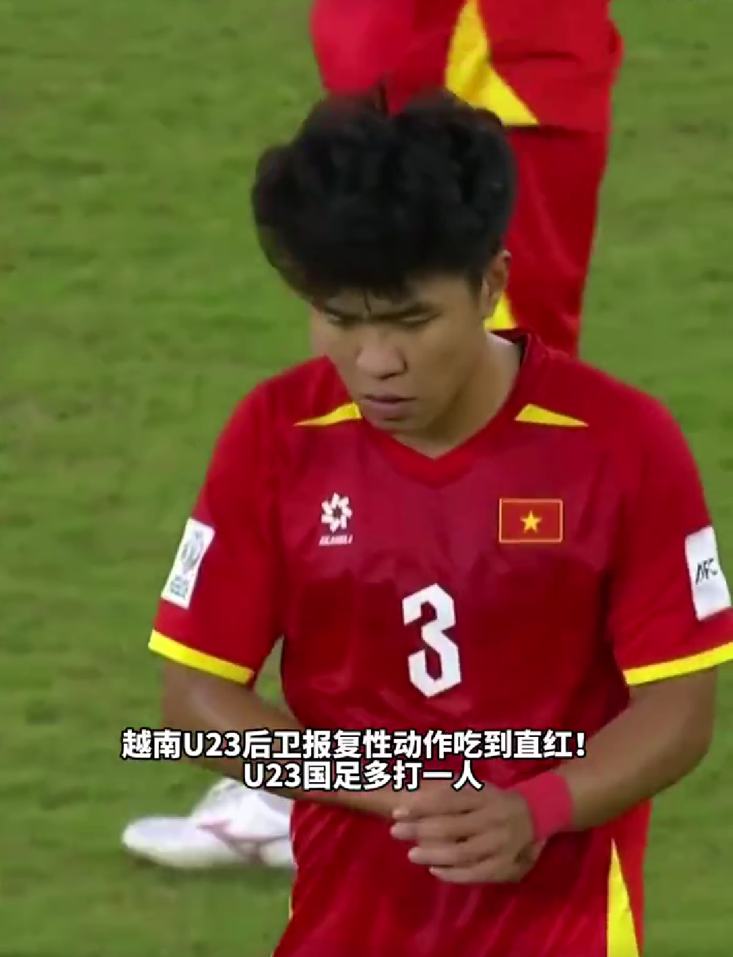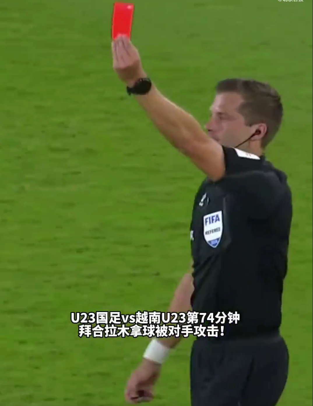 这场半决赛打到第74分钟,U23男足2-0领先越南队时,越南中卫范理德在一次无球状态下突然挥拳击打了正欲捡球快发的中国球员拜合拉木背部,