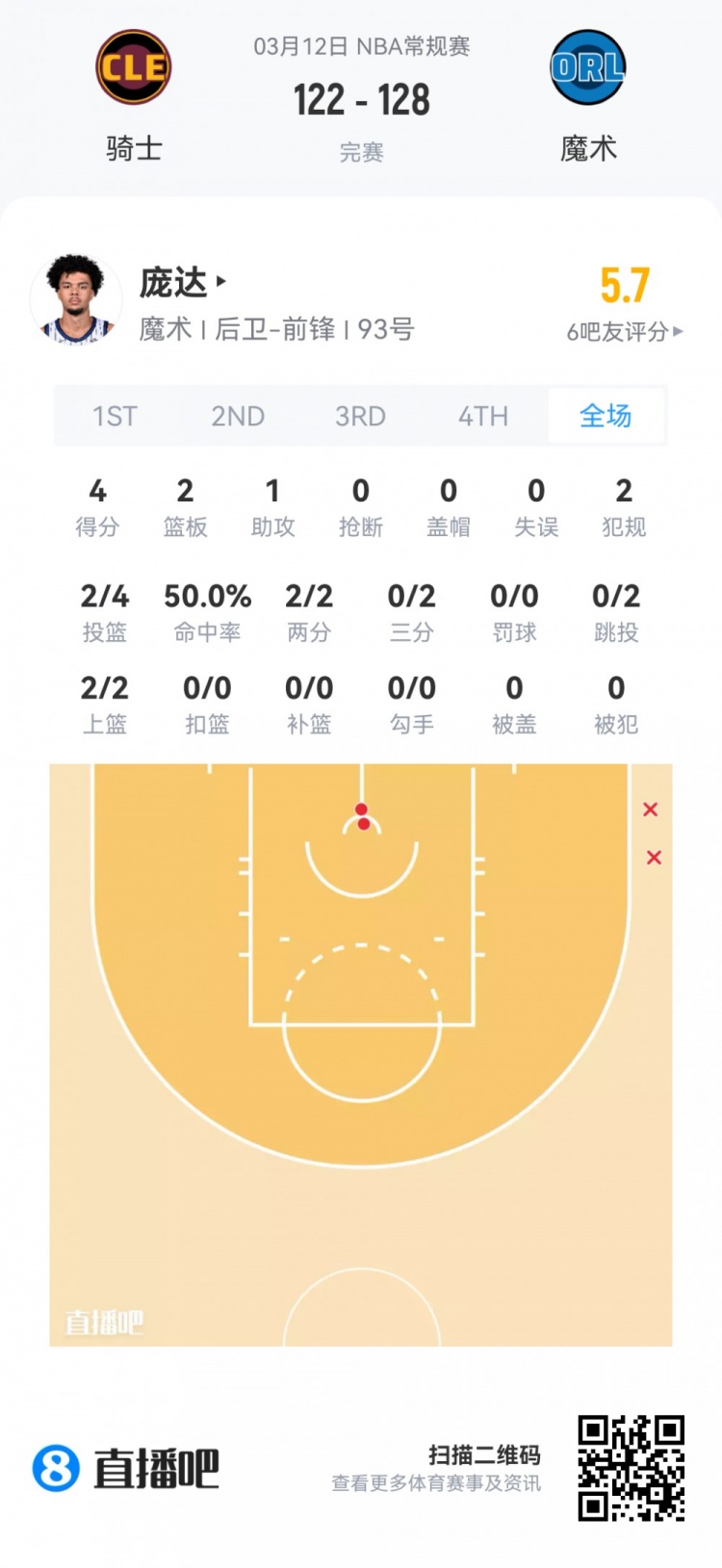 魔术次轮32号秀庞达 登场11分钟