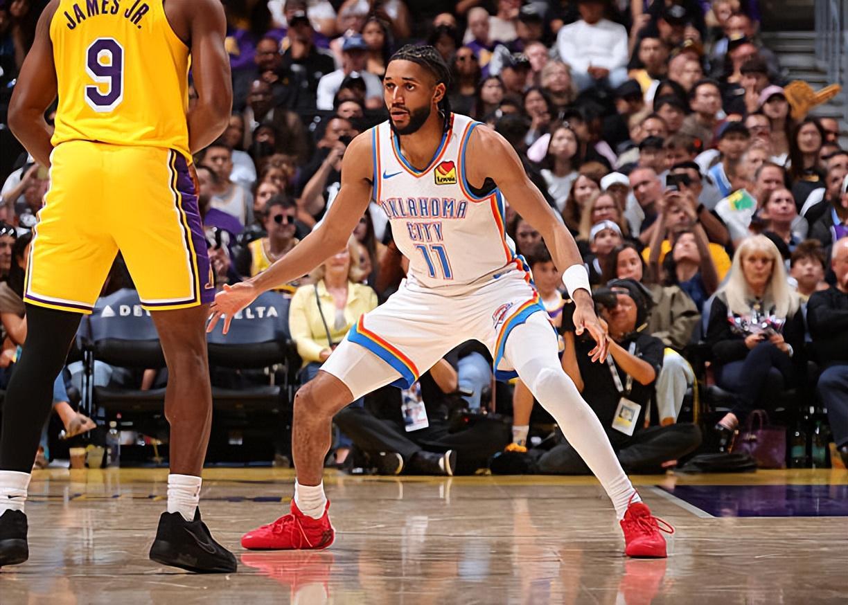 本场比赛中,雷霆的替补外线投手以赛亚-乔(Isaiah Joe)的表现依然是非常出色的。乔全场出场18分14秒,投篮9中6,三分线外9中6,以超高的效率拿下了18分2篮板的数据,还有1次失误和1次犯规,正负值更是达到了全场次高的+31。乔在本场比赛中的出场时间并不多,出手次数其实也并不多,但是他又一次将自己超强的投射能力发挥了出来,他也是拿下了大量的分数,给湖人制造了巨大的威胁。除此之外,乔在防守端的表现也算是中规中矩,也没有出现什么问题。乔在场上时球队的局面也是一片大好,这也能够体现在他超高的正负值上。毫无意外,乔的强势表现也是球队能够取得一场大胜的关键因素。