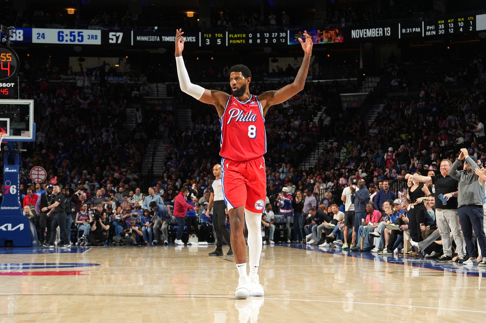 上半场,76人球星乔治表现出色,进攻端十分高效并且防守也不错,打了14分半,投篮7中6,三分球4中3,罚球4中3,拿到18分1篮板2助攻2抢断的数据,正负值+4。