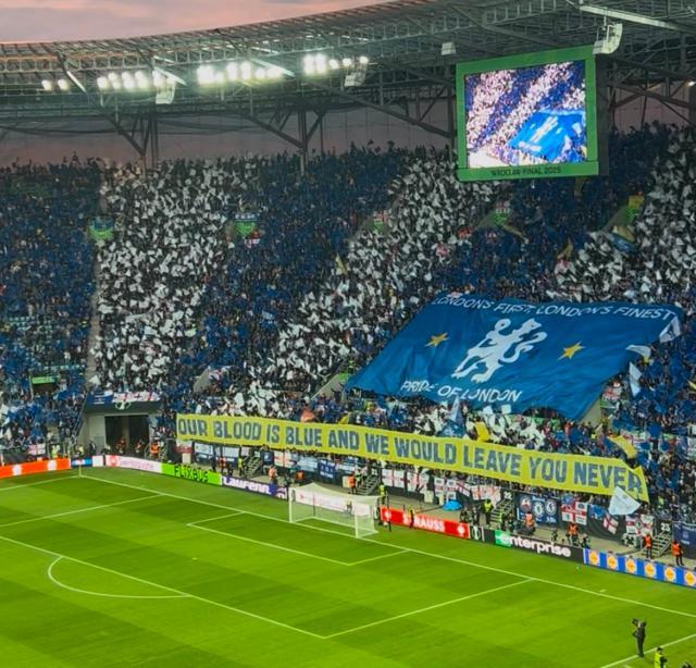 弗罗茨瓦夫市政球场的座位配色,与贝蒂斯的绿白色无比接近,而场内的贝蒂斯球迷也在气势上完全压制住了切尔西球迷。切尔西看台上还有些许空位,贝蒂斯看台则完全座无虚席,整齐划一的呐喊声和战歌声基本都由贝蒂斯看台发出。在报送切尔西首发名单时,现场嘘声四起,贝蒂斯拥趸几乎是将欧协联决赛的中立场地变成了球队主场比利亚马林球场。